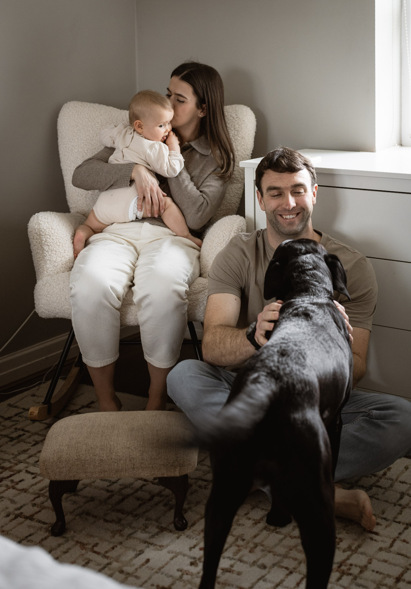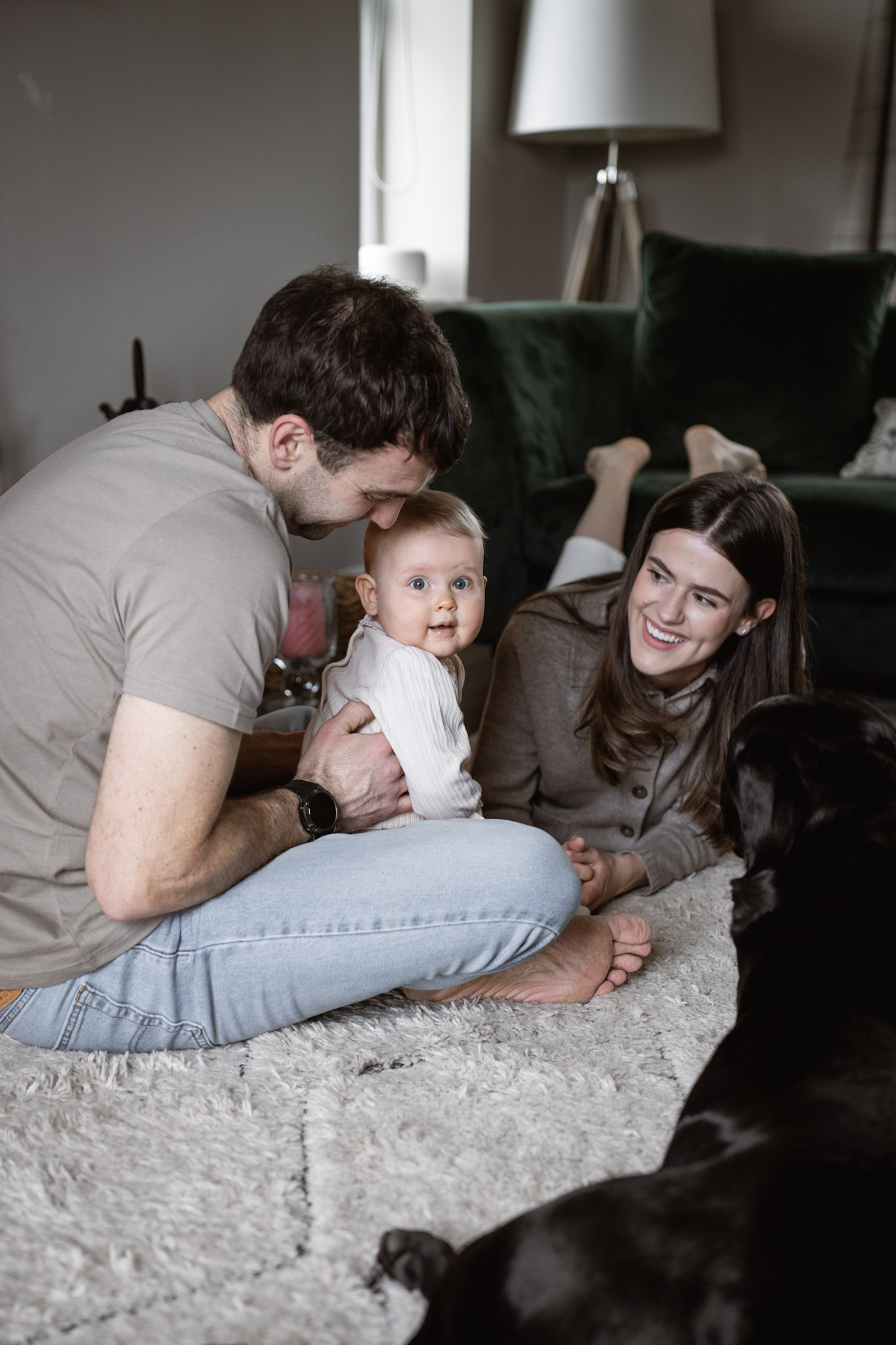 This shoot took place at home, surrounded by soft light, warm cuddles, and one very proud black Labrador who clearly thought he was in charge of baby Evie’s safety.