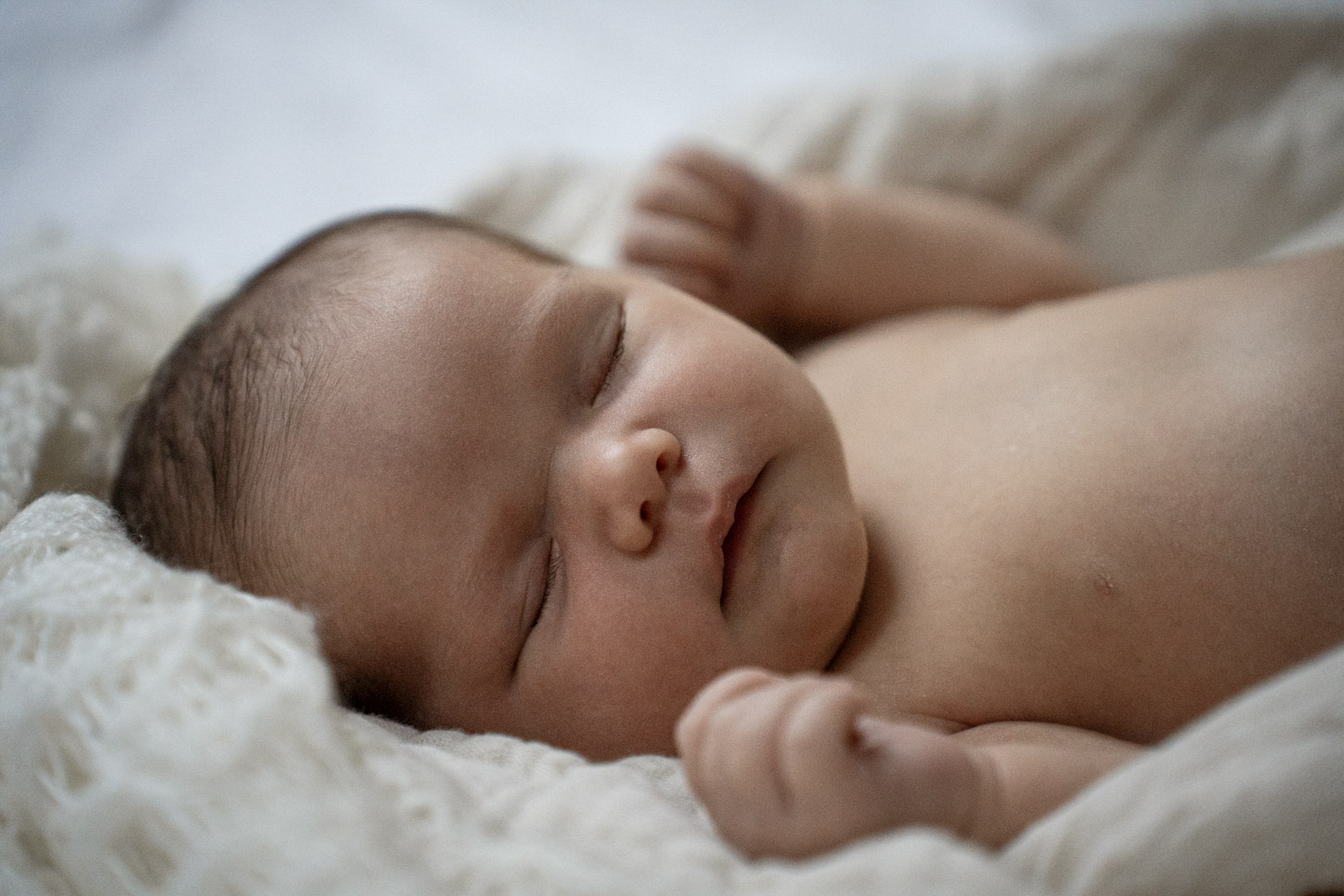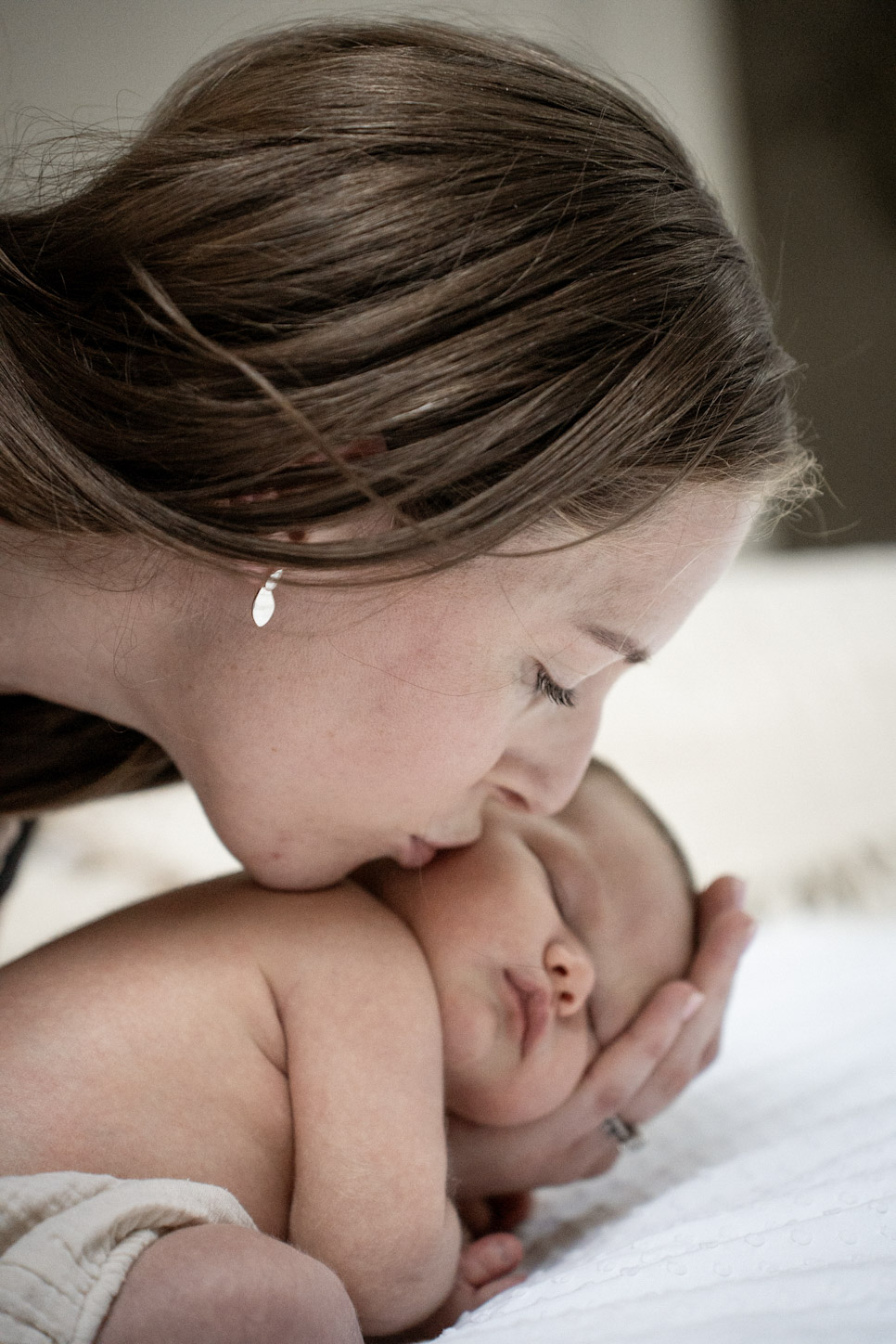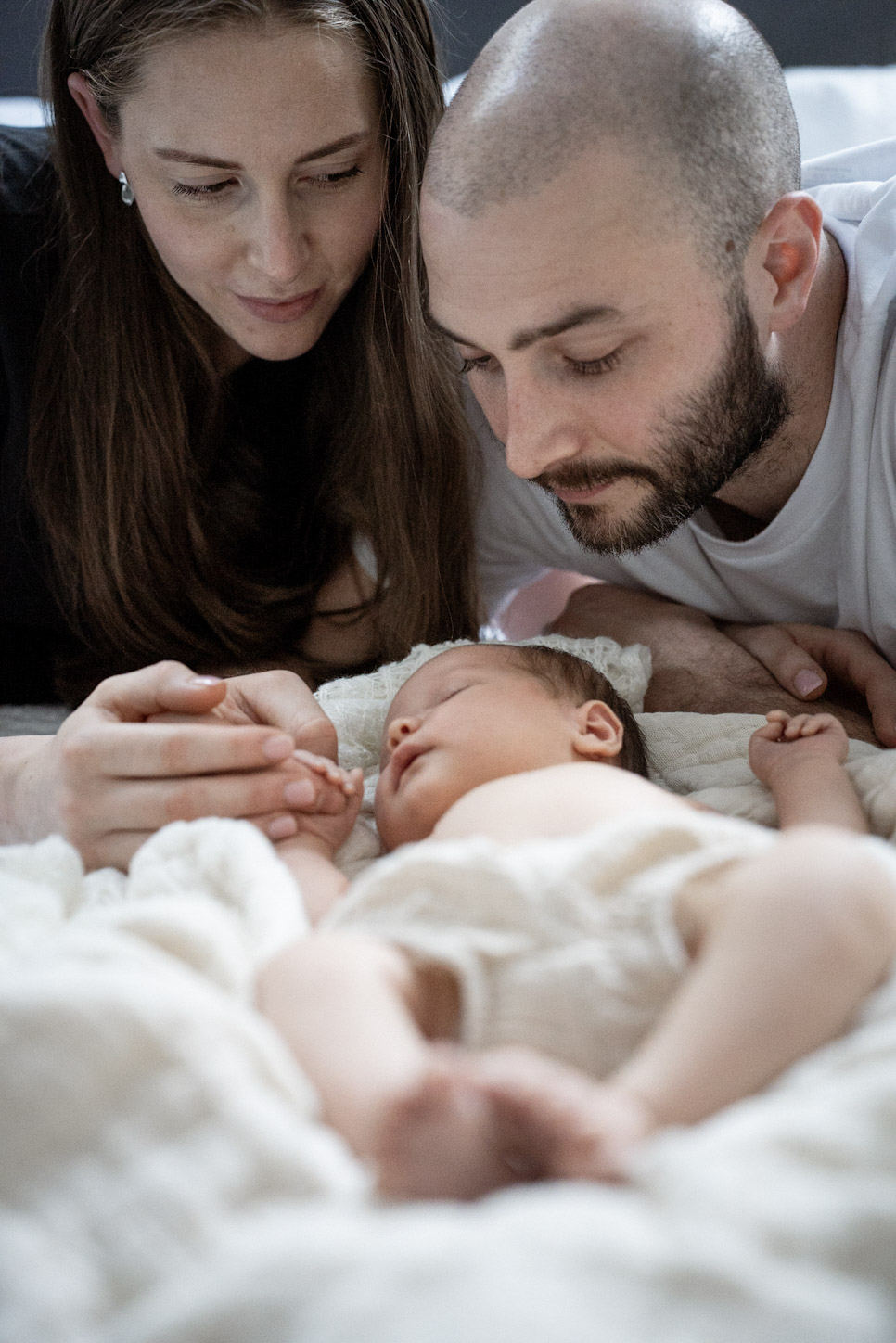 This newborn session took place in the comfort of home, just two weeks after this little girl arrived. She was wonderfully sleepy, perfectly curled up, and completely content being snuggled by her mum and dad.